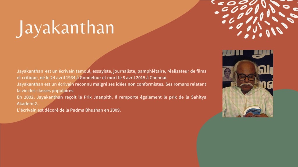 Un roman écrit par Jeyakanthan (1934-2015). Sous sa plume, plus d’une centaine de nouvelles, 40 romans et essais ont été écrits. Il a été journaliste, grand orateur, passionné de marxisme, cinéaste d’art et producteur, ce qui lui a permis d’avoir de multiples facettes. À travers ses œuvres, Jeyakanthan nous raconte avec vivacité non seulement l’imposture et les contradictions de la vie de l’élite indienne éduquée, mais aussi la vie réelle et sans fard des opprimés.