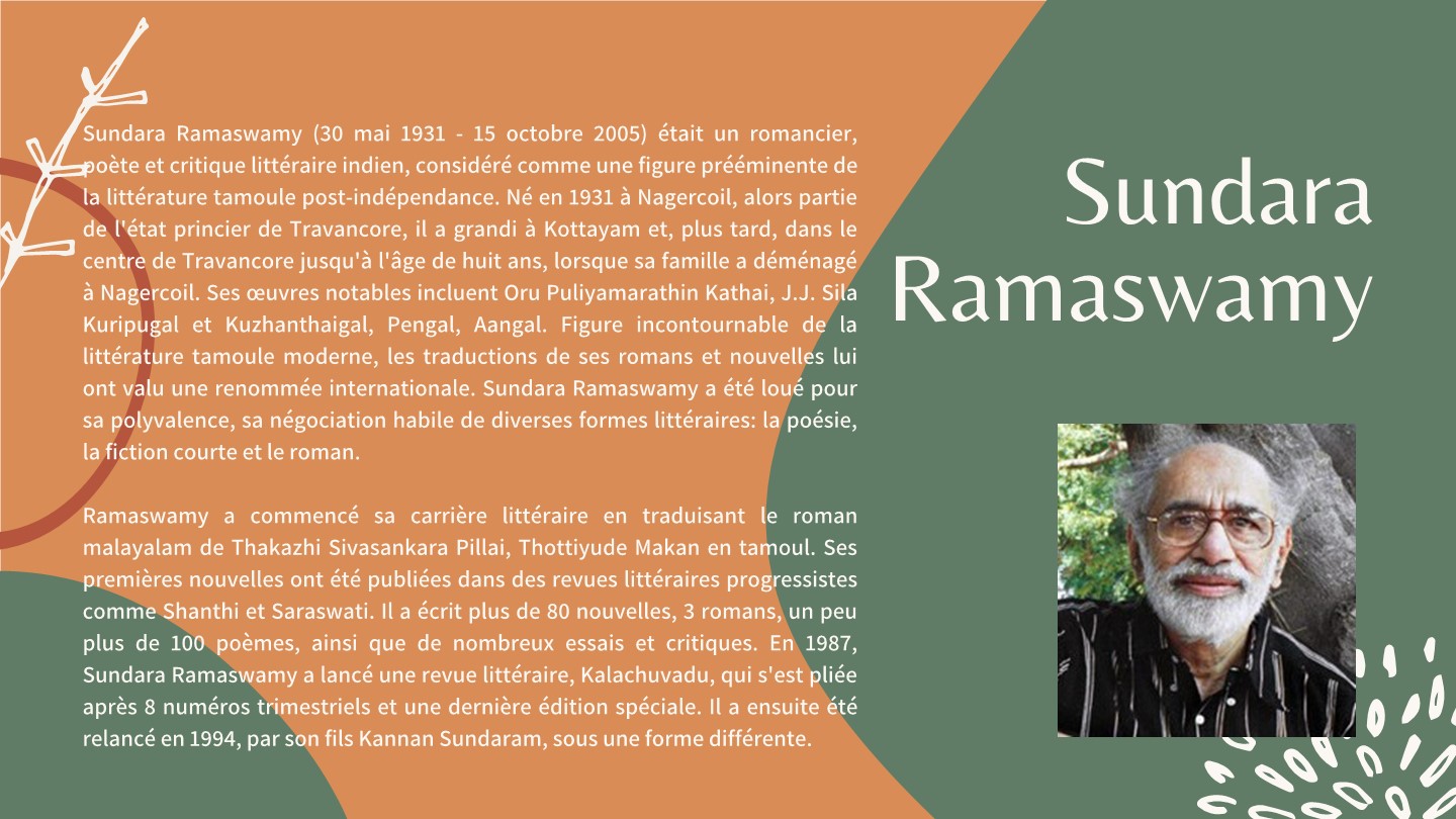 Sundara Ramasamy (1931 -2005) est l’auteur de ce roman. Les romans, nouvelles, essais et poèmes qu’il a écrits nous montrent ses multiples visages dans le domaine de la littérature. Il a beaucoup semé pour les changements qui ont eu lieu dans la littérature tamoule moderne aujourd’hui. L’auteur a insisté pour une teinte radicale dans les œuvres tamoules modernes. Il était contre les écrits de type soap-opéra et littérature de gare. Ainsi, le personnage principal de ce roman l’écrivain J. J. et des qualités appréciées chez lui par l’auteur nous expliquent qui est le héros illustré par l’auteur ?