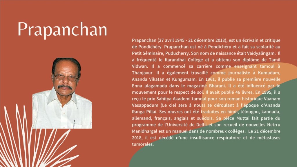 L’auteur est Prabanjaan (1945-2018), né et vécu à Pondichéry, l’ancien comptoir français. Un style de narration fluide, des textes non ennuyeux à lire, des mots non hypocrites et surtout une voix contre l’autorité, voilà ce que l’on retiendra de son travail. Et bien entendu, un auteur postcolonial.