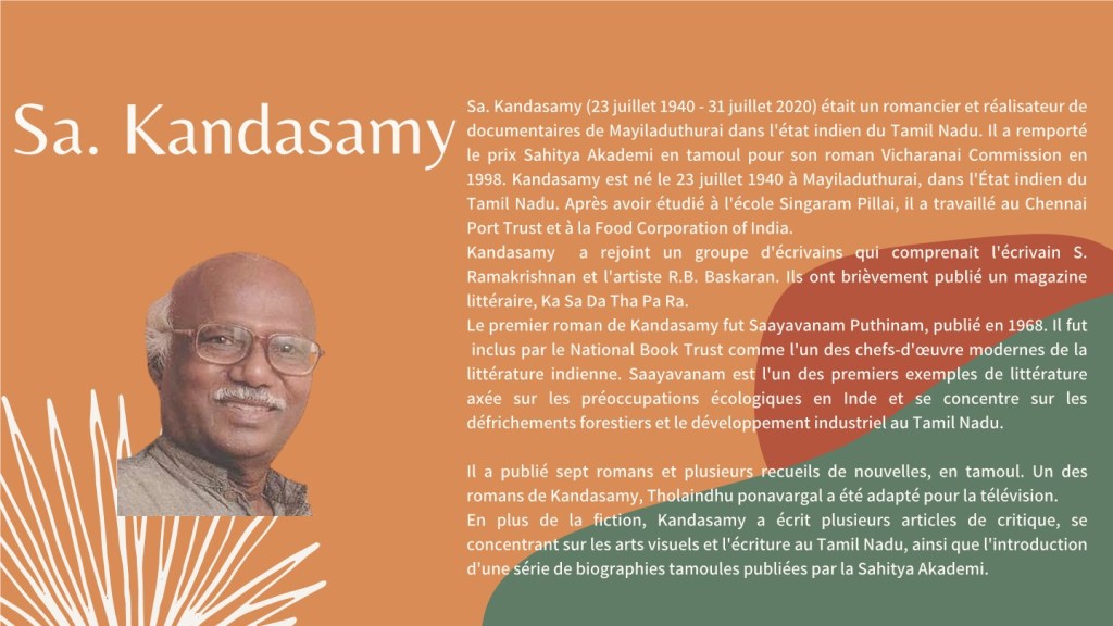 C’est un roman de Sa. Kandasamy (1940-2020), écrit en 1969. L’écrivain Saa. Kandasamy s’est également intéressé aux beaux-arts et au documentaire, et ce dernier lui a valu un prix. Cette subtilité a été transmise, nous le constatons, dans ses œuvres littéraires. Saayavanam, un village imaginaire se trouvant dans la région du delta du Tamilnadu, a été pris comme paysage de l’histoire. Écrit il y a quarante ans, à une époque où l’on parlait peu de l’environnement, cet ouvrage traite de la lutte d’un homme contre la nature pour sa survie.