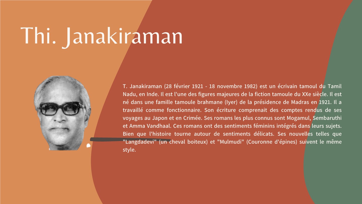 C’est un roman écrit en 1964 par T. Janakiraman (1921 – 1982). Parmi les auteurs appréciés, sa place est assurée.