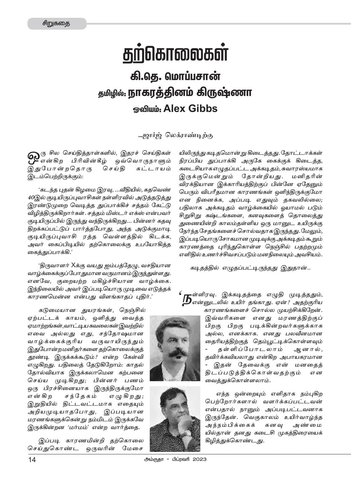 அன்று தெருமுனையில கூறுகட்டி விற்ற பெண்மணியிடம், வயிறென்று ஒன்றிருக்கிறதே என்பதற்காக வேண்டியவற்றை வாங்கிக்கொண்டு திரும்பிக்கோண்டிருந்தாள். இவள் குடியிருக்கும் வீட்டு வாசலில் நின்றுகொண்டு அவன் உற்றுப்பார்ப்பது போலிருந்தது, சந்தேகமில்லை இவளைத்தான் பார்க்கிறான். சுருள் சுருளான தலைமயிரைப் பின்பக்கம் அணைத்துச் சீவியிருந்ததும், அதற்குரிய முகமும் அவன்தான் என்கிற சந்தேகம் வீட்டுவாசலை நெருங்கநெருங்க திடப்பட்டதும், முதன்முறையாக மனதில் இலேசாக வெட்கமும் மகிழ்ச்சியும். வீட்டை நெருங்கியவள், அவன் இவளைப் பார்த்து, « இன்னா தனம் எப்படியிருக்க ? » என்று தொட்ட கையை உதறிவிட்டு விடுவிடுவென்று வீட்டிற்குள் நுழைந்து தனது ஒண்டுக்குடித்தன கதவின் பூட்டைத் திறந்தபோது, அவன் இவள் பின்னால் நின்று தொண்டையைச் செருமினான். அதற்குள் வாசலில் இருந்த மற்றக் குடித்தனக்கார பெண்களில் இரண்டொருவர் கூடியிருந்தனர். வெத்திலைப் பெட்டி சகிதமாக அங்கு வந்த வீட்டுக்கார அம்மா « வாய்யா ! இப்பத்தான் உனக்குப் பொண்டாட்டி நெனப்பு வந்ததா ? » என்று கேட்டவள் தனத்திடம், « ஒன் கோவத்தையெல்லாம் பிறகு வச்சுக்கோ, முதலில் வந்தவருக்கு உள்ள அழைச்சுபோய் ஒரு வாய்த் தண்ணிகொடு, நீ ஒண்ணும் கொறைஞ்சிடமாட்ட » எனவும், சீவராசும் உரிமையோடு வீட்டுக்குள் நுழைந்தான்.