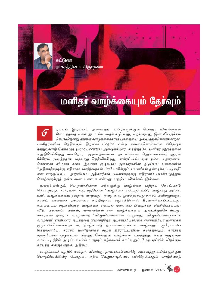 பிறப்பும் இறப்பும் அனைத்து உயிர்களுக்கும் பொது. விலங்குகள் கிடைத்ததை உண்பது, உண்டதைக் கழிப்பது, உறங்குவது, இனப்பெருக்கம் செய்வதென்று தங்கள் வாழ்க்கைக்கான சித்தாந்தத்தை அமைத்துக்கொள்கின்றன. மனிதர்களின் சிந்திக்கும் திறனை Cogito என்ற கலைச்சொல்லால் பிரெஞ்சு தத்துவவாதி தெக்கார்த் (René Decartes) அழைக்கிறார். சிந்தித்தலே மனிதர் இருத்தலை உறுதி செய்கிறது என்கிறார். முரண்நகையாக நா காக்காச் சிந்தனையாளர் ஆயுள் சீக்கிரம் முடிந்ததாக வரலாறு தெரிவிக்கிறது, சாக்ரட்டீஸ் ஒரு நல்ல உதாரணம். சென்னை விமான சுங்க இலாகா குடிவரவு முகவர்களின் தடுப்புப் பலகையில் ‘’அதிகாரிகளுக்கு எதிரான வார்த்தைகள் பிரயோகிக்கும் பயணிகள் தண்டிக்கப்படுவர்’’ என எழுதப்பட்ட அறிவிப்பு. அதிகாரிகள் பயணிகளுக்கு எதிராகப் பயன்படுத்தும் சொற்களுக்குத் தண்டனை உண்டா என்பது பற்றிய விளக்கம் இல்லை.